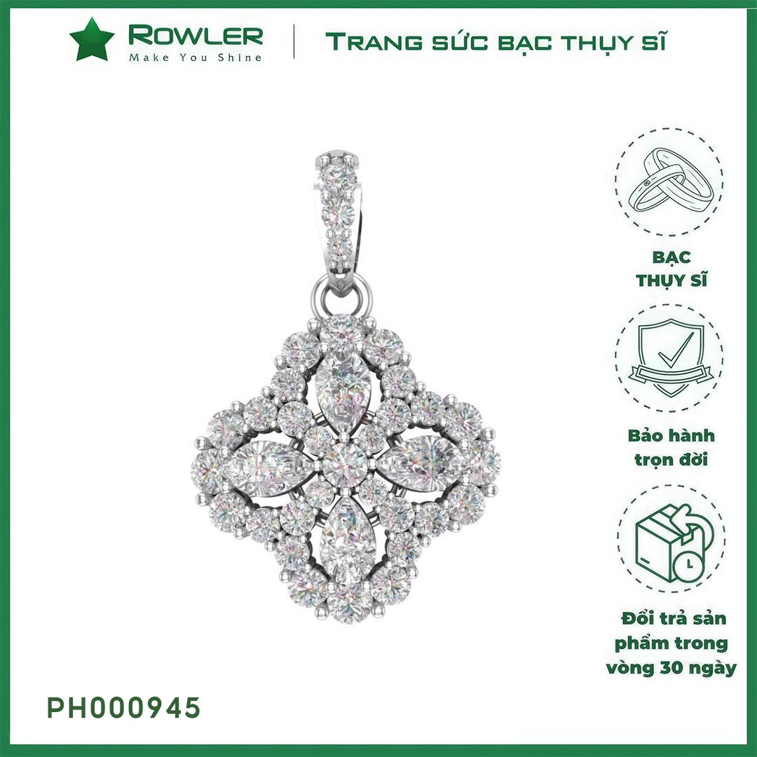 - Lấy ý tưởng từ phong cách tối hoàng gia sang trọng, mặt dây chuyền đến từ thương hiệu Rowler , được làm từ chất liệu bạc Thụy Sỹ cao cấp kết hợp cùng viên đá Moissanite chiếu sáng lấp lánh tựa kim cương và hoàn thiện bởi lớp xi phủ Rhoidum giúp làm tăng độ sáng bóng và độ bền của sản phẩm theo thời gian.